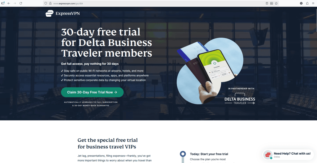 Start by visiting the official Express VPN website at Express VPN for Delta Business Traveler. Look for the “Get Started” button or the Free Trial offer on the homepage. Express VPN frequently displays its trial offers prominently, so it should be easy to find. The 30-day free trial for Delta Business Traveler members offers exclusive access to premium services, including access to Delta’s business travel tools and benefits, such as priority support, flight tracking, and more. This trial allows members to experience enhanced travel services at no extra cost for 30 days.